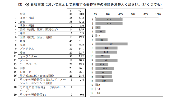 As shown in the above survey, most copyrighted works fall under the categories of “text/language,” “music,” and “video,” accounting for a significant proportion. In a majority of cases, usage can be limited to some form of promotion only.
