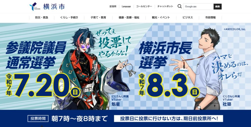 The top page of Yokohama City's website gives the impression that it employs strategies like using characters to “encourage younger generations to take an interest in elections.”